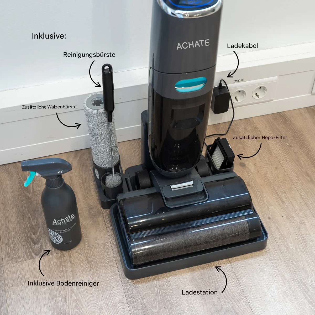 Nach Jahren der Entwicklung hat der Achaté Wischsauger – Nass & Trocken jedes Reinigungsproblem gelöst, indem er ein Gerät geschaffen hat, das mit deinen Böden, Teppichen und harten Oberflächen arbeitet – anstatt gegen sie.