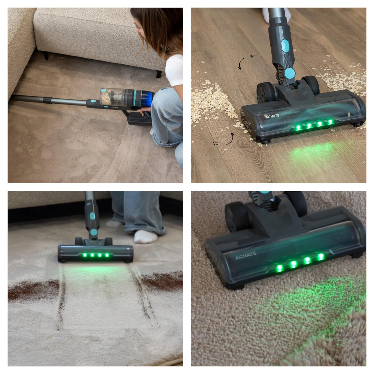 Im Gegensatz dazu wurde der Achaté Stabstaubsauger PRO speziell mit Blick auf die Gesundheit Ihrer Böden entwickelt. Dank intelligenter Stauberkennung und grünem LED-Präzisionslicht reinigt er gründlich, ohne Kratzer zu hinterlassen, während sich das leichte, kabellose Design geschmeidig über alle Oberflächen bewegt.