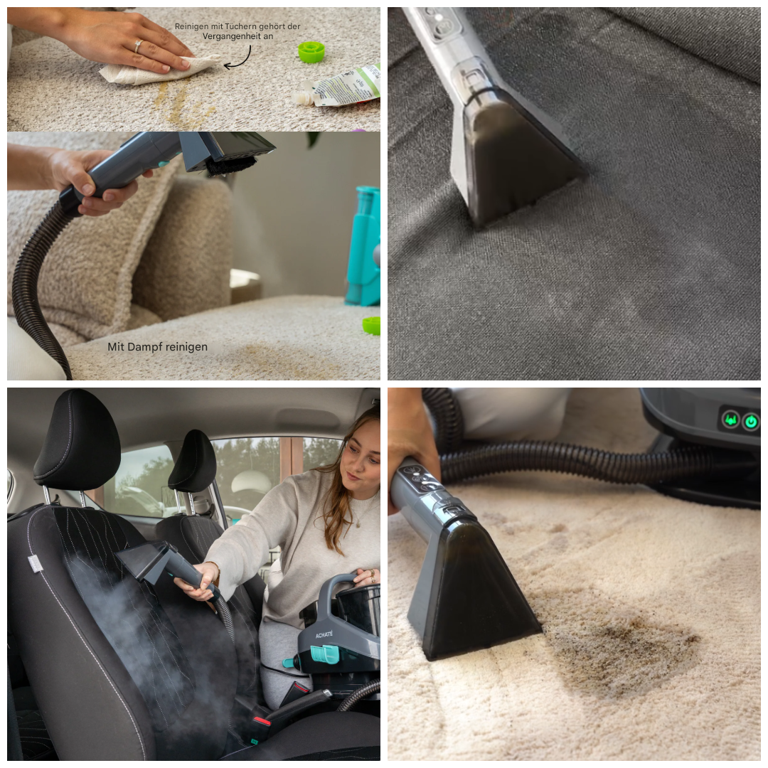 Die Lösung sind nicht noch mehr Sprays oder immer neue Hilfsmittel. Es ist ein intelligenter Reiniger, der sich an jede Oberfläche und jedes Material anpasst – genau das, was der Achaté Fleckenreiniger PRO mit leistungsstarkem Dampf, heißem Wasser und schneller Trocknung bietet.