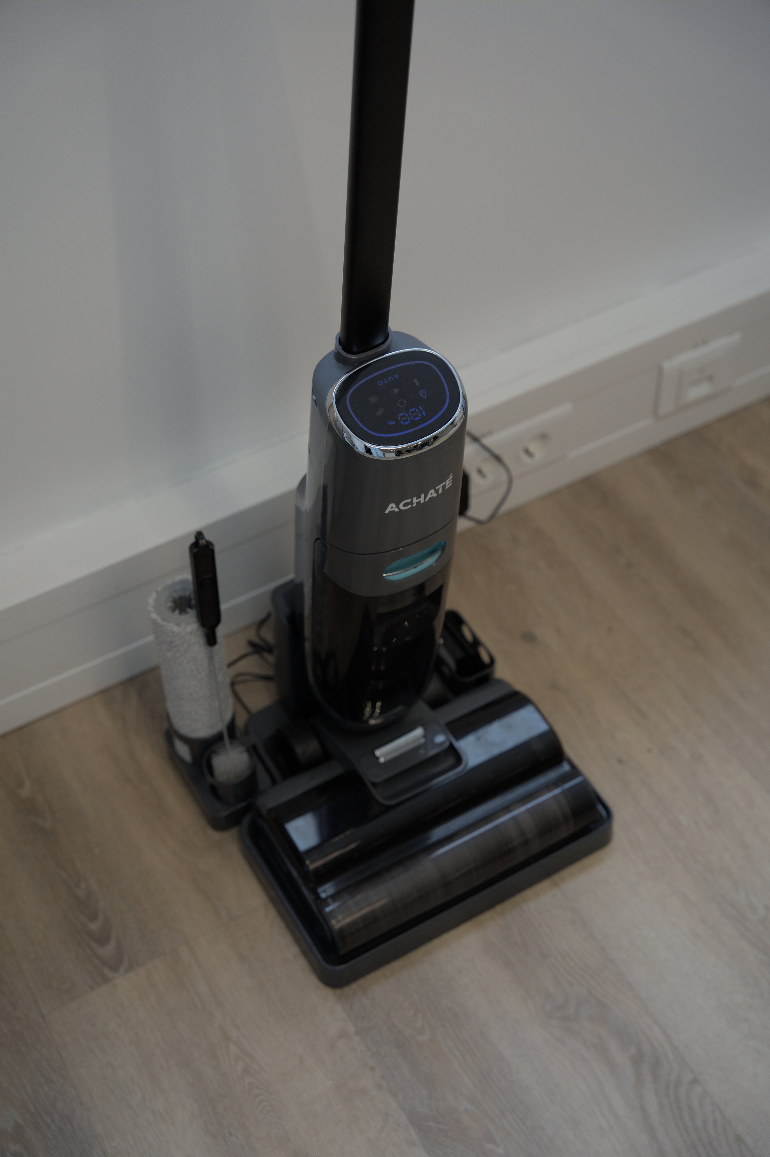 In tegenstelling tot andere producten op de markt gaat de Achaté dweilstofzuiger maar liefst 55 minuten lang mee! Je kan dus makkelijk je gehele huis schoonmaken in één keer. En als je klaar bent zet je hem eenvoudig weer op de bijgeleverde oplaadbasis, start je het zelfreinigingssysteem, leeg je de vuilwatertank en klaar!