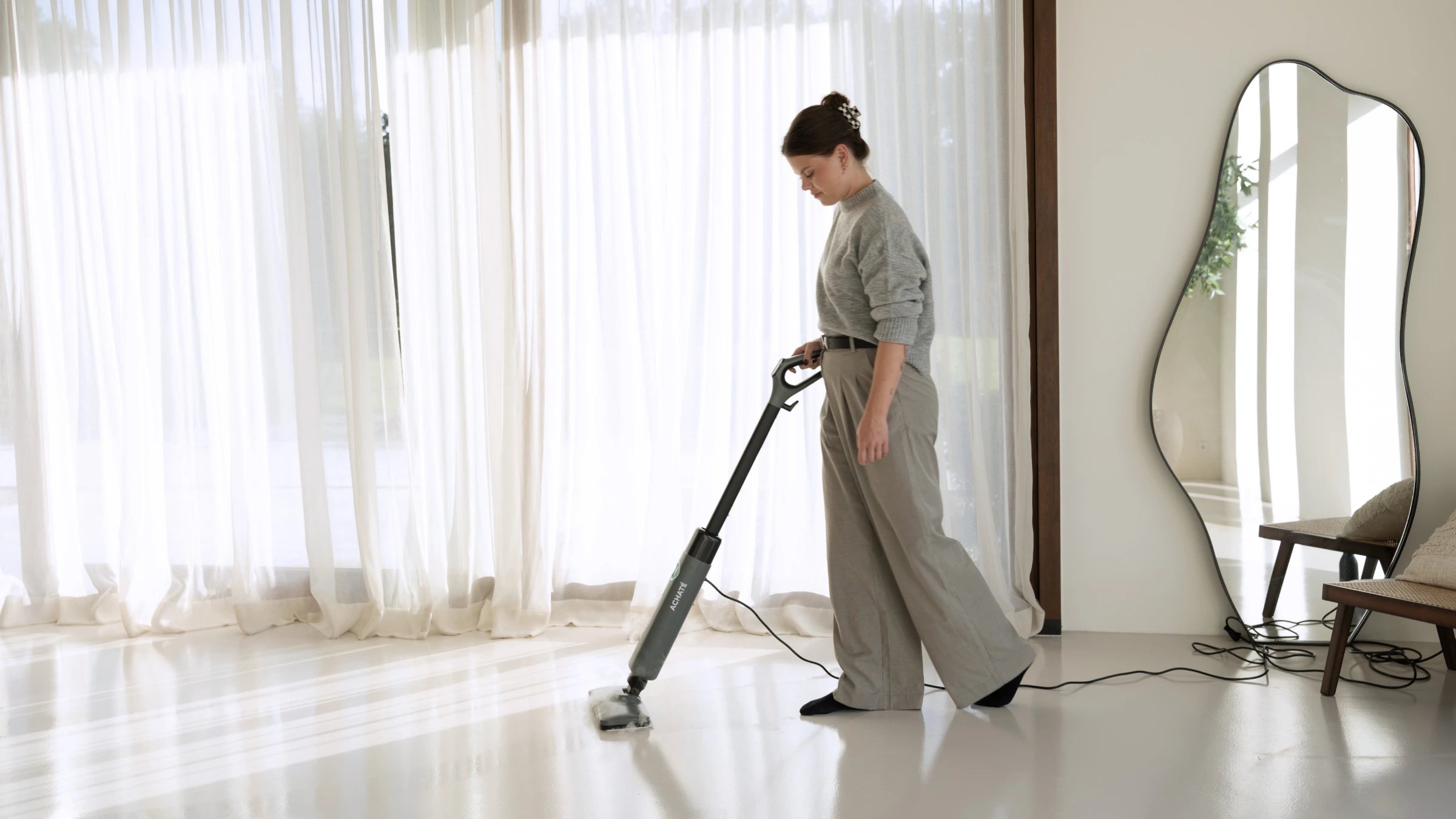 Het in elkaar zetten van de Achaté stoomreiniger is in twee stappen gefixt. Door de snoer van 7 meter kan jij gemakkelijk elke hoek van je huis schoonmaken en hoef je niet continu weer met je dweil naar de emmer toe te lopen voor schoon water. De Achaté stoomreiniger draagt zijn watertank met zich mee waardoor schoonmaken nog nooit zo makkelijk en grondig tegelijk is geweest.